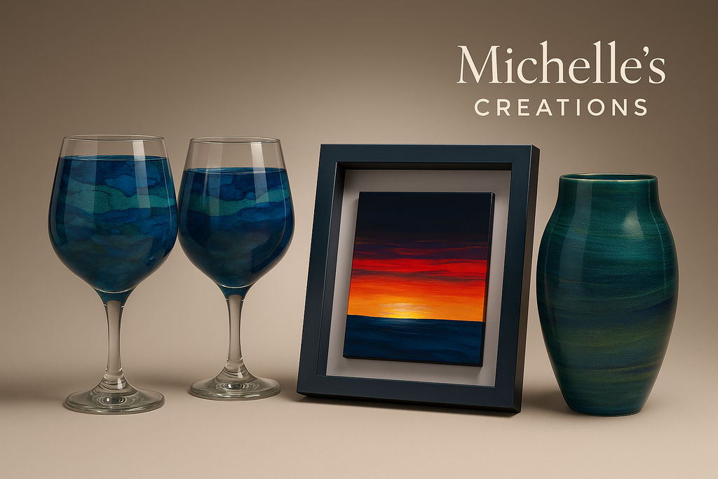 At Michelle’s CREATIONS, every piece tells a story. Whether it’s the shimmer of resin and mica powder swirling through custom wine glasses and vases, or the vibrant movement of a Dutch pour canvas painting, Michelle brings beauty to life with her hands and heart.